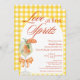 Rústico Elegante Amor Chic Cute No Primeiro Chá de panela Spritz - Apresentando uma Aperol Spritz de Cores de Água com um frango de fatia alaranjada, adornada com um arco de laranja coquete. O convite tem um fundo amarelo xadrez gingham rústico e um quadro de arco branco. As palavras "Love at first Spritz" são escritas numa mistura de caligrafia refinada com escrita e texto elegante de laranja queimado escuro. Edite este modelo de chá de panela com seus próprios detalhes de evento. Também disponível como download digital instantâneo, envio fácil via texto, email ou mídia social.