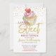 Um convite de festas chá de panela lindo. Este convite fabuloso apresenta um cupcake de aquarela sobre um fundo de confete dourado. Fácil de personalizar com os seus próprios detalhes do festival.