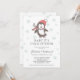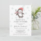 Pinguim bonitinho de inverno com flocos de neve convidando chá de fraldas em um estilo neutro com gênero, com o ditado: bebê é frio lá fora.