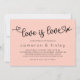 Gay bonito ou convite de casamento lésbico em cor-de-rosa pincelado com um roteiro bonito dizendo que o amor é amor com pequenos corações.