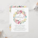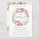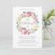 Esta moda e belo convite para o casamento apresenta uma coroa de flores e folhas aquáticas em lindos tons de blush, rosa, amarelo, verde e lacre.