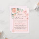 Um fundo rosa dourado com rosa dourado e arco cor-de-rosa. Decorados com ouro rosa e borboletas cor-de-rosa esbranquiçada, rosa, eucalipto verde e borboletas. Personalize e adicione o nome da noiva a ser e os detalhes da festa. Texto: Amor em Bloom Back: cor de fundo rosa dourada.