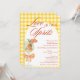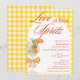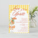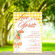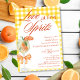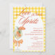 Convite de Chá de Noiva Elegante Rústico e Fofo - Apresentando um spritz de Aperol pintado à aguada com uma rodela de laranja como enfeite, adornado com um laço de laranja coquete. O convite tem um fundo amarelo xadrez rústico e uma moldura branca em arco. As palavras "Amor à primeira Spritz" são escritas em uma mistura de caligrafia refinada e texto escuro em letras maiúsculas elegante na cor laranja queimada. Edite este modelo de convite de chá de noiva com os detalhes do seu evento. Também disponível como download digital instantâneo, facilmente enviado por mensagem de texto, e-mail ou mídia social.