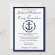 Um Convite para Casamento de Tema Náutico com Âncora num Fundo Branco com Marinho, destaques e texto. O inverso é um fundo Marinho com faixas brancas e texto. Para personalizar, basta inserir seus detalhes usando nosso modelo fácil, substituindo o texto de exemplo. Certifique-se de ver os cartões e acessórios correspondentes a esta Coleção de Casamentos de Tema de Âncora Náutica.