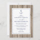 Quando você está tendo um casamento inspirado na praia e quer um pouco de charme rústico, este conjunto de casamento realiza ambos. Este convite apresenta um fundo de madeira rústica, uma borda de linha tracejada e uma âncora azul naval náutica.