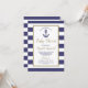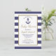 Este convite de chá de bebê náutico apresenta uma âncora azul-marinho em um retângulo com borda em dourado falso sobre um fundo de listras azuis-marinho e brancas. Dentro do retângulo, as palavras "Chá de Bebê", o nome da futura mãe e o prazo para resposta de RSVP aparecem em escrita à mão em dourado. O texto restante está em azul-marinho. Ideal para um chá de bebê de menino. O texto é completamente personalizável. Precisa de itens combinando para o seu chá de bebê temático náutico? Veja nossa coleção para suprimentos de festa e decoração adicionais neste design.