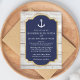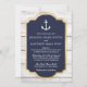 Um convite de casamento náutico com temas náuticos, com um ícone de âncora, uma falso moldura de ouro e madeira rústica.