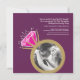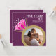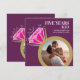 Convide amigos e familiares para uma festa especial de cinco anos de casamento ou celebração de jantar com esses tons dourado, rosa, vinho escuro e branco. Gráficos de um anel de eternidade de ouro e turmalina rosa e duas fotos do então e do agora no centro dos convites de aniversário de 5 anos com temática de anéis. Personalizado com suas próprias fotos do dia do casamento do casal e uma foto atual no verso, e adicione suas próprias palavras de celebração, data da festa e local. Outros itens combinando estão disponíveis. Arte e design gráfico original do anel por www.mylittleeden.com na Zazzle.