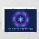 Estrelas fractais, cor-de-rosa e azul, entrelaçadas de David sobre fundo escuro com texto hebraico lendo "Ani L'Dodi V'Dodi Li" (Eu sou meu amado e meu amado é meu). RSVP e placas de agradecimento com o mesmo design também estão disponíveis.