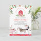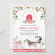 Quintal, fazenda ou quintal de menina doce, convite de aniversário com vários animais de exploração bonitos, celeiro vermelho e arranjo floral. A design também apresenta algumas folhas e maçãs vermelhas. O convite de aniversário temático desta menina é ideal para a festa de aniversário temática de fazenda de uma menina.