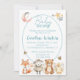Convite de chá de bebê com tema de vida silvestre na floresta apresenta um lindo design em aquarela com uma raposa, uma ovelha, um urso e um patinho. Eles estão reunidos em um jardim de flores silvestres e dois doces abelhões estão coletando néctar. A lua e algumas estrelas estão no céu. Personalize o convite com todas as suas informações usando o modelo fácil de usar fornecido. Certifique-se de atualizar o verso com onde a futura mamãe está registrada! Versões adicionais também estão disponíveis na coleção.