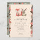 Apresentando uma raposa e coelhos fofinhos e folhas de madeira, este chá de fraldas elegante de casais ou convite para borrifar pode ser personalizado com suas informações especiais sobre eventos. O reverso apresenta folhas de madeira espalhadas sobre um fundo verde de sábio. Projetado por Thisnotme©