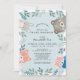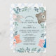 Este cartão de convite para chá de fraldas de menino giro e rústico apresenta um fundo azul-bebê rodeado por verdes com bosques/animais de inverno que são raposa, coelho, urso e panda vermelha. O verso apresenta um fundo branco com padrões de verificação pintados à mão em azul-bebê. Personalize-o para as suas necessidades. Você pode encontrar mais produtos para urso polar na minha loja.