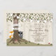 Um convite para chás de fraldas que ilustra uma raposa, uma coruja e um guaxinim em volta de uma árvore embrulhada em banner que diz, "Bem-vindo, Bebê" Árvore apresenta raízes expostas, folhas verdes e cogumelos. Montagem em branco acima do texto personalizável.