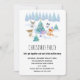 Convite de Natal com uma cena natalina caprichosa. Felizes animais da floresta dançando em torno de uma árvore de Natal decorada com presentes embaixo. Desenho festivo de aquarela de Natal.