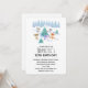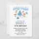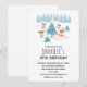Convite de aniversário com uma cena caprichosa da floresta. Felizes animais da floresta dançando em volta de uma árvore de abeto verde com presentes embaixo. Design alegre e alegria em aquarela.