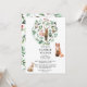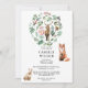 Um convite à chá de fraldas de aquarelas de animais da floresta rústica em um estilo neutro em relação ao gênero, animais fofos de bruxas. Raposa, pássaro, veado, coelho e verde em círculo.