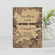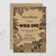 Primeiro convite de aniversário em papel kraft castanho monocromático, cheio de graça e divertida, reproduzindo uma arte selvagem da selva tropical completa com uma coleção de animais selvagens fofos. Este tema apresenta animais selvagens e aves como elefante, chita, girafa, zebra, macaco, tucano e avestruz, moldando o cartão. O cartão apresenta uma tipografia texturizada 'Wild One' personalizada exclusiva. A cor e o texto de fundo podem ser personalizados de acordo com o seu requisito.