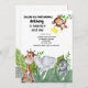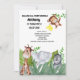 Convite bonito do primeiro aniversario dos animais do safari de selva da aguarela. Caracteriza as folhas e plantas verdes no meio dos animais do safari. Há um macaco que balança de uma videira ao longo da parte superior deste convite. Fácil personalizar com sua informação do partido.