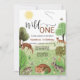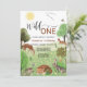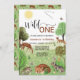 Primeiro aniversario "Wild One", uma festa de design florestal moderna e colorida e neutra do ponto de vista do gênero, numa letra elegante, com raposa bebê, coelho, ouriço e outros animais e aves florestais num campo com árvores.