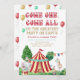 O convite de aniversário do Circus para crianças de qualquer idade, que você pode personalizar com uma foto atrás. O convite chama-se "Venha Todos para a Grande Festa da Terra... [nome] está a tornar-se [idade]!" A design apresenta uma grande parte com animais de circo que praticam no parque, incluindo elefante, tigre e urso. O verso tem sua foto, que é exibida no formato vertical do retrato e enquadrada com balões.