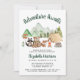 O doce bebê rústico, o chamado "sprinkle", que apresenta uma ilustração fofa de animais florestais (um urso, raposa e guaxinim) com sua tenda e acampamento nas montanhas e florestas e "Aventura Aguarda" e o nome da futura mãe em um roteiro verde escuro.