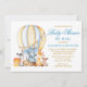 Moderno Elegante Aquarela Animais Bebês Ar Quente Chá de fraldas de Balões de Ar Quente por Email Invitation. Os bebês incluem elefante com Arco azul, macaco, girafa, rinoceronte, zebra e leão. Dourado e Blue Script.