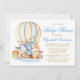 Moderno Elegante Watercolor Bebês Balão de Ar Quente em Chamada de Chá de fraldas de Nuvens. Os bebês incluem elefante, macaco, girafa, rinoceronte, zebra e leão. Texto Dourado e Azul. Bolinhas De Volta.