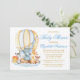 Moderno Elegante Watercolor Bebês Balão de Ar Quente em Chamada de Chá de fraldas de Nuvens. Os bebês incluem elefante, macaco, girafa, rinoceronte, zebra e leão. Texto Dourado e Azul.