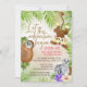Super fofo e divertido "Que a aventura comece" animais da selva convite para o chá de fraldas do bebê. Este convite apresenta um macaco fofo pendurado numa árvore, numa preguiça e num limor.