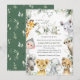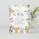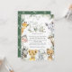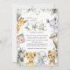 Convide amigos e família de estilo e dê o tom para seu dia especial com este charmoso convite para chás de fraldas. A design apresenta os animais da selva (girafa, macaco, zebra, leão, elefante, chita, meerkat, rinoceronte) e as folhas de eucalipto em fundo branco.