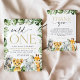 Convide amigos e família de estilo e dê o tom para o seu dia especial com este charmoso convite de aniversário. A design apresenta os animais da selva (zebra, leão, elefante, girafa) e as folhas de palma sobre fundo branco.