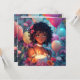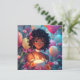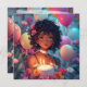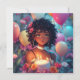 Bonito convite personalizado de aniversariante. Gráficos bonitos de uma linda moça de anime afro-americana e cabelos bonitos e encaracolados cercados por balões e flores rosas, roxas e azuis. Estas são bonitas para uma adolescente ou pré-adolescente.