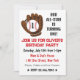 Para os entusiastas do beisebol! Convite de festas de primeiro aniversario de um garoto divertido. Luva marrom com um beisebol vermelho e branco apresentando o número 1. Tipografia desportiva. Aniversário. Primeiro Aniversário do Menino.