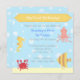design de cartoon de animais submarinos, fofinhos e coloridos, constituídos por cavalos de mar amarelos, lulas cor-de-rosa, peixes riscados e caranguejos vermelhos. Torne o seu bebê ou a festa da menina especial com este adorável cartão de aniversário de animais submarinos que vai impressionar seus convidados. Projetado por Rusty Doodle.