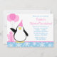 Um convite de aniversário cor-de-rosa e azul adorável do país das maravilhas do inverno do floco de neve. Caracterizando um pinguim bonito, balões do aniversário e presente. Faz um excelente convidar para uma festa de aniversario de meninas temático do inverno.