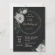 Convite de aniversário único com flores brancas românticas e folhas verdes sobre fundo preto. PARA MAIS PRODUTOS CORRESPONDENTES, clique na coleção acima ou entre em contato comigo.