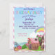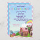 Este convite de festas personalizado peculiar apresenta um tema bonito e colorido da terra doce. Uma cidade ilustrada de casas doces e árvores é ilustrada com uma pequena estrada e colinas pastosas e um céu azul. Um bonito arco-íris pastel pode ser visto atrás das casas. A borda apresenta um padrão cor-de-rosa e branco de canas doces listradas com hortelã-pimenta.
