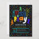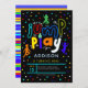 Salta e comemora com este convite de aniversário dos meninos neon! Apresentando texto ousado "saltar e jogar", saltando silhuetas, e sotaques de bolinhas divertidos e coloridos — perfeito para um trampolim ou uma festa de salto. Definido como um convite de 9 anos, mas totalmente personalizável.