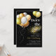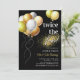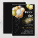 Convites de aniversário conjunto preto e dourado com um fundo preto elegante, balões de festa cintilantes e um modelo de texto "duas vezes o divertimento" que é fácil de personalizar.