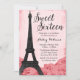 Convites temáticos do doce 16 de Paris. Caracterizando uma ilustração preta da torre Eiffel e uns rosas cor-de-rosa em um vintage pique o fundo. Alguns gráficos por www.jwillustrations.com