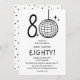 Faça 80 anos com nossos convites de 80 e moderno. O nosso design apresenta uma bola de disco única desenhada à mão formando o '0' no número 80, estrelas retrorreflectoras dispersas e um modelo de festa casual em uma excitante letra manuscrita, tudo em um fundo branco de eterno. Este convite especial funde diversão e elegância, um verdadeiro reflexo do que é fazer 80.