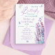 Este convite incorpora uma extraordinária ternura, elegância e delicadeza. Ele apresenta uma representação aquosa de um arbusto de lavanda, capturando lindamente sua essência. Adicionando ao seu encantador encanto, delicadas borboletas em tons de roxo macio, azul e rosa graciosamente adornam o design. O convite é preenchido com uma fonte elegante que se mistura harmoniosamente com essa composição leve e refinada.
