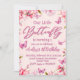 Entra num jardim branco onde borboletas cor-de-rosa delicadas se lançam entre flores florescentes e celebram sua Festa de aniversário, este convite é feito de forma especial com fundo rosa pastel e decorações florais de todos os lados com fontes correspondentes para dar o convite à vibração moderna na moda