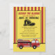Convite de aniversário de caminhão de bombeiros para uma criança que completou 4 anos, ou qualquer idade. Todo texto é personalizável. Um caminhão de bombeiros se senta sobre um fundo listrado vermelho e branco. Textos dizem: "Soem o alarme!" Personalizado com o nome, a idade e as informações da festa do seu filho. Entre em contato comigo para obter assistência com sua personalização ou para solicitar produtos adicionais de correspondência ou coordenação para o seu partido.