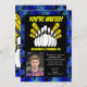 Adicione a foto do seu filho a esta convite de aniversário festiva que contém estrelas amarelas, boliches pretas e pinos brancos, e abstrato azul brilhante com design de salto divertido. Excelente para uma festa geral de rapazes ou raparigas ou uma festa de adolescentes, uma equipe de boliches ou um aniversário para qualquer idade. Adicione o nome do convidado de honra, os detalhes do evento e o título da festa na frente e Personalize todo o texto para o seu partido!