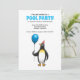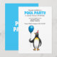 Convite para a piscina de aniversário do verão. É adequado para crianças e tem uma ilustração divertida com um pinguim que está pronto para a festa.