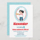 O convite para o aniversário deste rapaz mostra um lindo menino cabeludo negro segurando uma pizza, vestindo um chapéu chefs, avental e jeans azuis com t-shirt vermelha. Perfeito para uma festa de pizza.