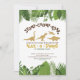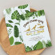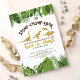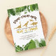 abaixe os pés e dê um ROAR é uma festa de dinossauro! Design apresenta um "rugido de tompo" editável e um dinossauro dourado cercado por folhas de florestas verdes tropicais.