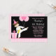 Um convite de aniversário para meninas para as artes marciais. Apresentando uma ilustração de menina de cabelos castanhos vestindo um cinto amarelo. Mostrado em tons de rosa e preto. Perfeito para uma festa de aniversário de Taekwondo ou Karate. Personalize facilmente as informações da sua parte.